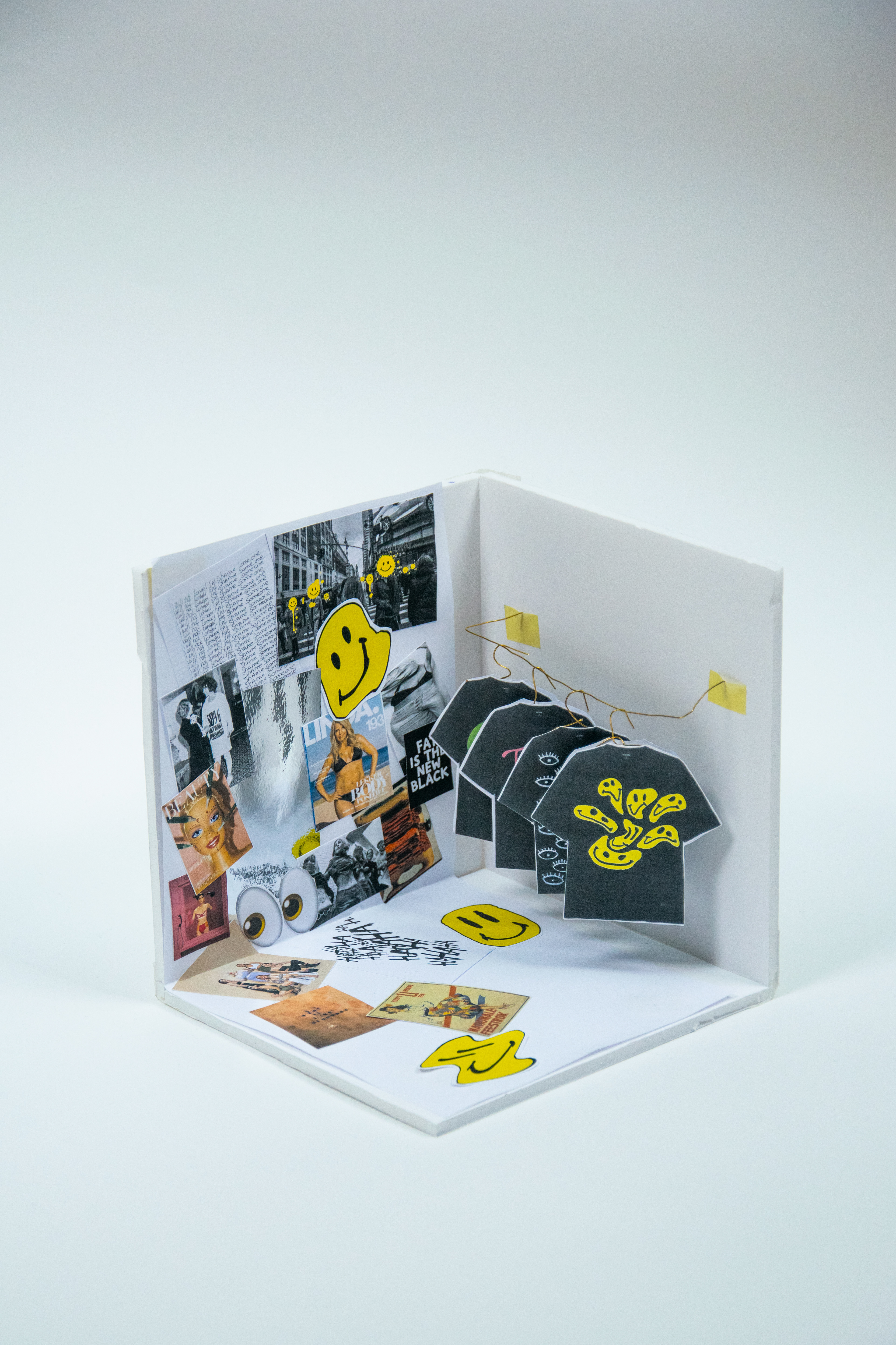 Kijken en bekeken worden, een dagelijkse bezigheid waar we ons niet heel bewust van zijn. Door middel van dit project wil ik mensen bewust maken dat we naar elkaar kijken en dat we vaak te snel een oordeel over elkaar vellen. Door het dragen van dit T-shirt wapen je jezelf, zodat je terug kan kijken. Zo maak je de aanschouwer er bewust van dat je terugkijkt en dat je bewust wordt over hoe we naar elkaar kijken.
